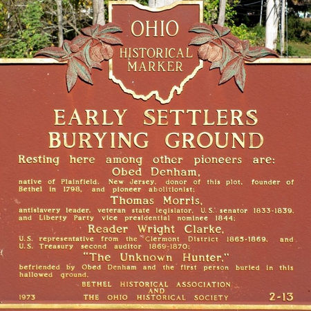 At Bethel Obed Denham purchased a tract of land, 1,500 acres in extent, on which he settled on the year 1797. He was a native of Virginia, but came here directly from Kentucky. He was a man of strong convictions, and disliking slavery, came to the then newly-consecrated territory of freedom with his family and kin, and having considerable means, was one of the prominent figures of the early history of the county. His home was just beyond the northwest limits of Bethel, where he died in 1817; his wife, Mary, deceased the following year, at the age of sixty-six years. They had sons named Timothy, who died in the township; John, who was a mill-owner; James, who lived a mile northwest of the village, but moved to Illinois many years ago; Obed E., who lived north of the village until his death. Of his daughters, Charity married Jeremiah Beck, and Sarah, Davis Crane. Rev. John Denham, a brother of Obed, lived on the same survey (No. 2373), in the eastern part. He was a Baptist preacher and a very old man when he came here, dying not many years after. His history, consequently, is poorly recollected. One of his sons was also called James, and from the fact of his being a very tall man was usually called "Long Jim." Rebecca, a daughter of Rev. John Denham, became the wife of Levi Beck. At one time the Denham's were very numerous in Tate, but by death and removal the number of the descendants has become very few, and the name now seldom occurs.